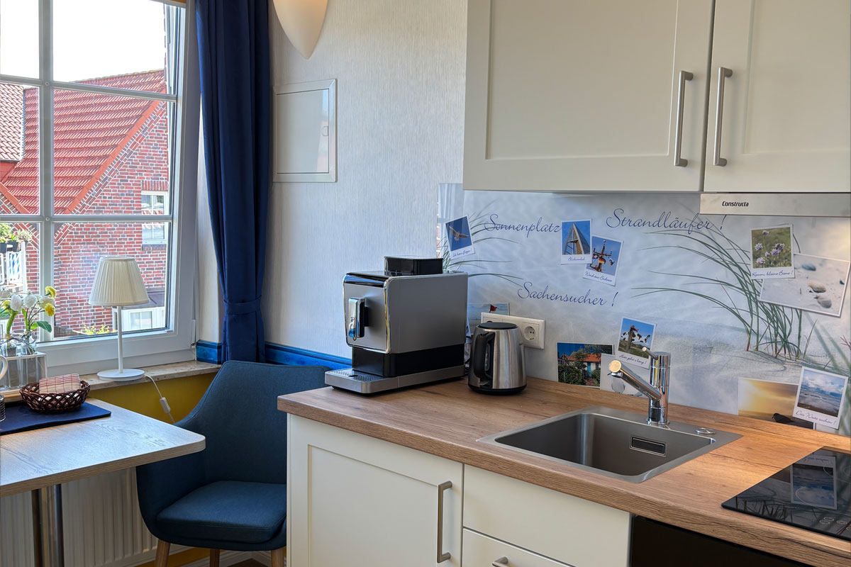 Die Küchenzeile ist gut ausgestattet und bietet Dir alles, was Du für eine unkomplizierte Selbstversorgung benötigst – vom Frühstück bis zum gemütlichen Abendessen.